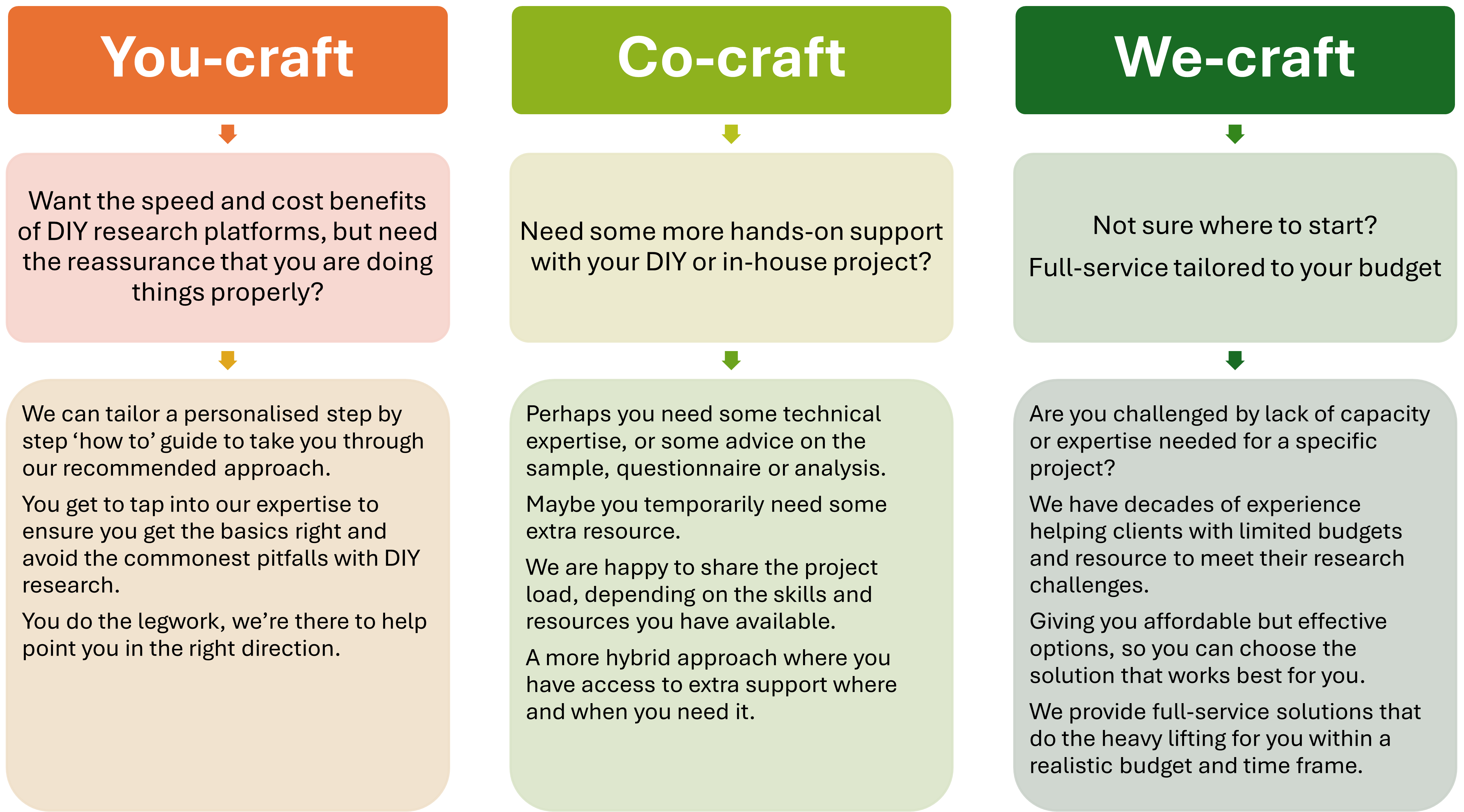 Whether you need a small amount of consultancy to help with your research, or you need us to do all the heavy lifting with a full-service project, we can provide whatever level of support you need, within a manageable budget.